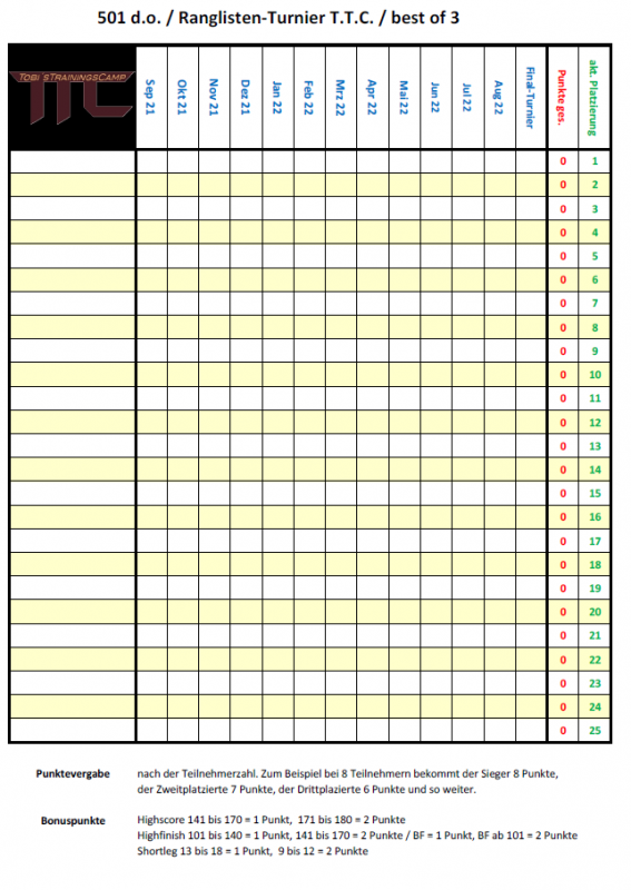 Gespielt wird immer 501 d.o. / best of 3.